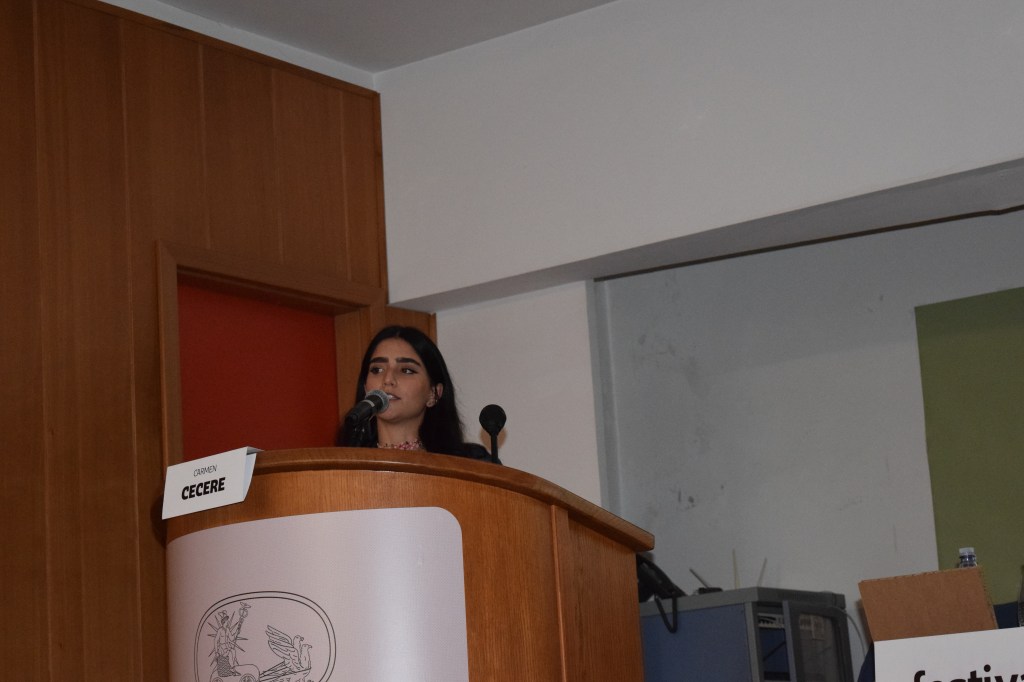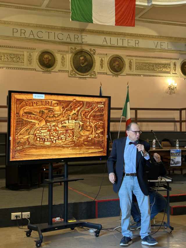 Liceo Classico “Torquato Tasso”, Aula Magna. Il prof. arch. Stefano Manlio Mancini illustra un’immagine di Insula Filiorum Petri (antico nome di Isola del Liri), altorilievo in stucco presente in una sala del Castello Boncompagni-Viscogliosi (Anni ‘30 del XVII sec.).